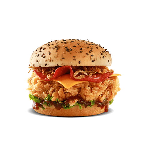 Legendary Zinger Fillet, Beef Pepperoni, Crispy Fried Onions, Cheese, and Birdies Sauce, All Nestled in a Black Sesame Bun.