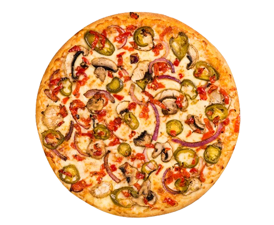 A vibrant medley of sweet tomatoes, mushrooms, peppery onions, briny olives, and green peppers.